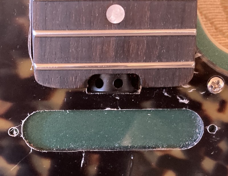 i also managed to install the string ferrules in the back without any obvious fuckups. they did not precisely fit the body regardless of claims by GFS, so i had to ream the apertures with a hand-held drill bit. using a powered drill would generate too much torque and take paint off in chips. that wasn’t too much trouble, but unfortunately the lips around the outside of the ferrules doesn’t fit the countersink either, and i’m not getting into hammering them in. so they stick out.