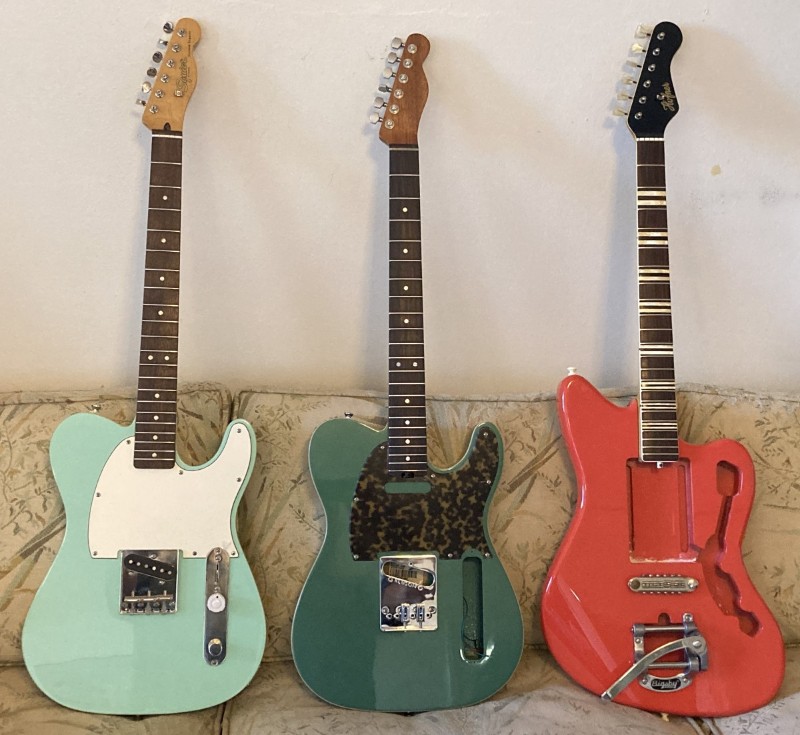 the Esquire is waiting for the string ferrules and capacitors, after which the only things left are filling/sanding the fingerboard and wiring it up. here you can see one of the Big Muff knobs on the volume pot. the Telecaster needs the pickups and controls ordered, and the neck pickup cavity routed out. i'm leaving the bridge partially disassembled because it'll have to come off for the bridge pickup to be installed. the Galaxiemaster is waiting for electrical components, needs routing on the pickup cavity and control area, and i have to design and order the pickguard.
