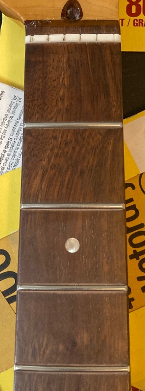 i sanded the first 2 frets with 1000->1500 grit and am quite pleased with the results. i don’t really see the point in polishing fretboards any finer than that because they’re going to have strings scraping across them. here again you can see the filler on frets 3 and 4, and how it disappears into the background once it’s oiled.