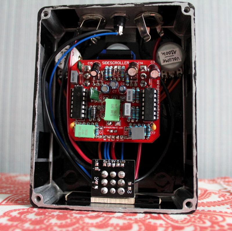 I finally finished the Sidescroller a month or so ago. It took a long time bcuz of components arriving slowly and general boxing-related stuff. Added a 56k resistor between R1 and R4 to make it less sensitive/more gated, might go back and mess with that some more. Black Hammerite paint, no markings, I know what the knobs do by now. Rad synth fuzz that makes u see Sonic sprites.