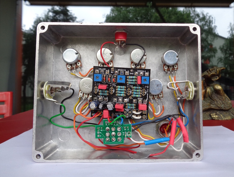 I decided to have the boost always on and moved the potentiometer to the front. I also put C1, C2 and C7 into sockets, so that I could easily swap those caps for more bass if needed (I use it on bass). Although, using the 3 band EQ, it can get pretty bass heavy with the stock values.