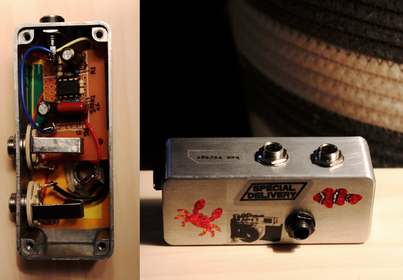 Left: Designed a dual filter from scratch. Makeup gain knob. Switch for boost, switch for filters.