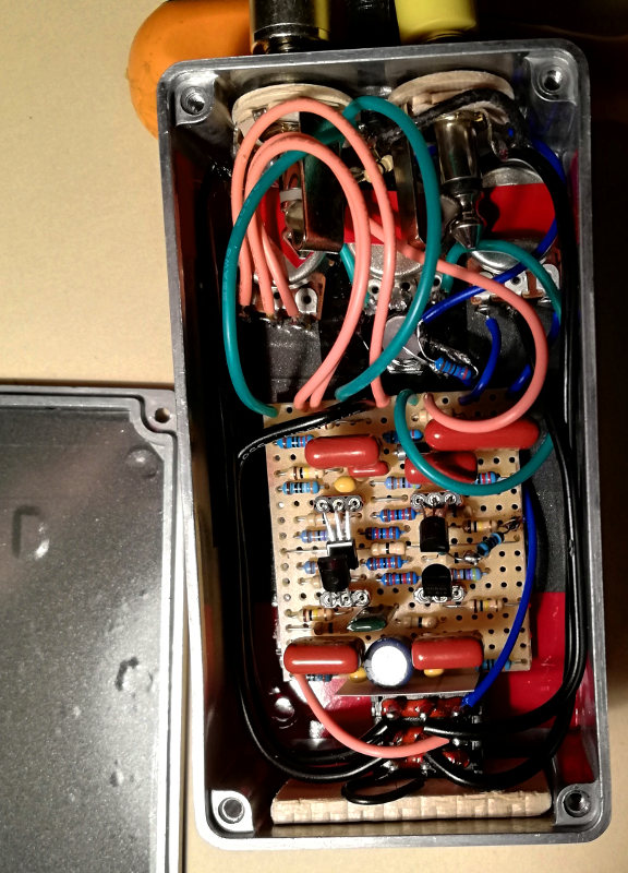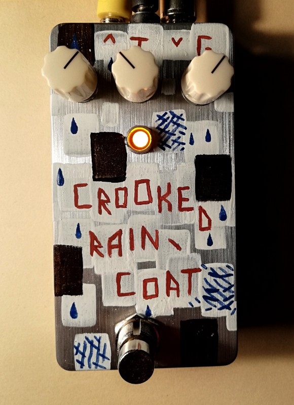 This is my first Muff-style clone, it's the freely available Raincoat by buggfx. Four BC549s, space to use some big caps, stupid tight fit in 1590B but I was lucky. However, shit fits crooked here and there, switch is off-center, hence the name. Also Pavement. The resistors sticking up is a fix to get a tranny.. grounded. Now it makes.. gold soundz. Alright it sounds like a gated Muff. I adjusted those resistors to keep it sustaining for a good while, really like the range of the pots too.