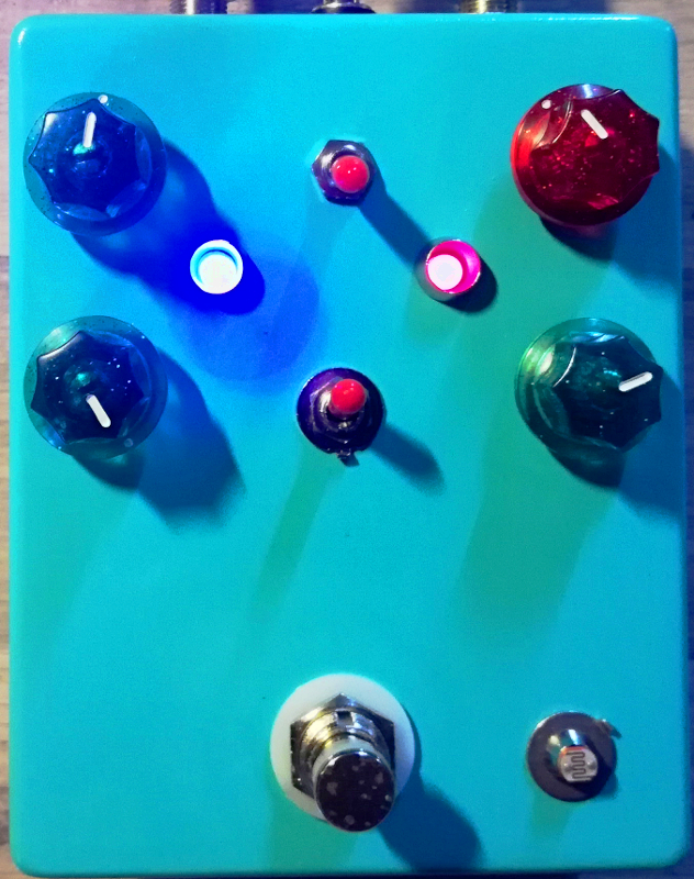 Started by gutting the box of a Shoe Pixel clone I want to re-do and drilling a few more holes in it. One for an LDR that when switched on (bottom toggle) gives you some warble/delay ramp up functionality. I had to tinker with it a bit, ended up adding a 5v zener and 1nf cap, which somehow made this function work when the fuzz was on. Without it, the delay would turn off after a few seconds with both fuzz and LDR on. Now it's fine, more subtle than I'd like but still gives it some extra weirdness. Because of the mods, the feedback doesn't self-oscillate, but it's also not as dark my other Cave Dweller-based pedal. I also didn't have all the right pots (3xB50k) so I used an A50k for the Echo and B25k + adjusting some resistors for Time. Ended up losing the shortest delay time, so the range just goes from medium to long basically.