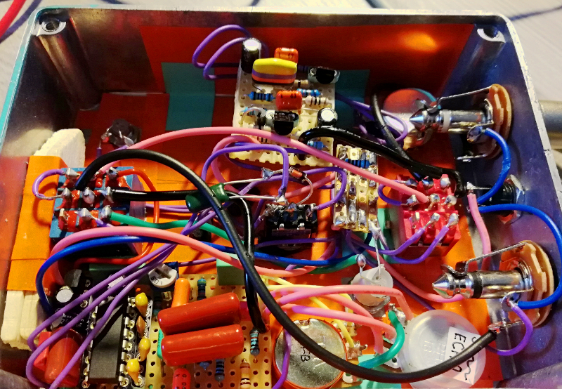 Another one. This is a Madbean Cave Dweller (with "bright" mods) and a Soulsonic Heavy Darling fuzz (before the delay, top toggle). It was what I had the parts for, would fit and need no more than 4 pots. My first try at a two-in-one pedal and it worked out pretty nicely, although more work than I thought it would be, of course.