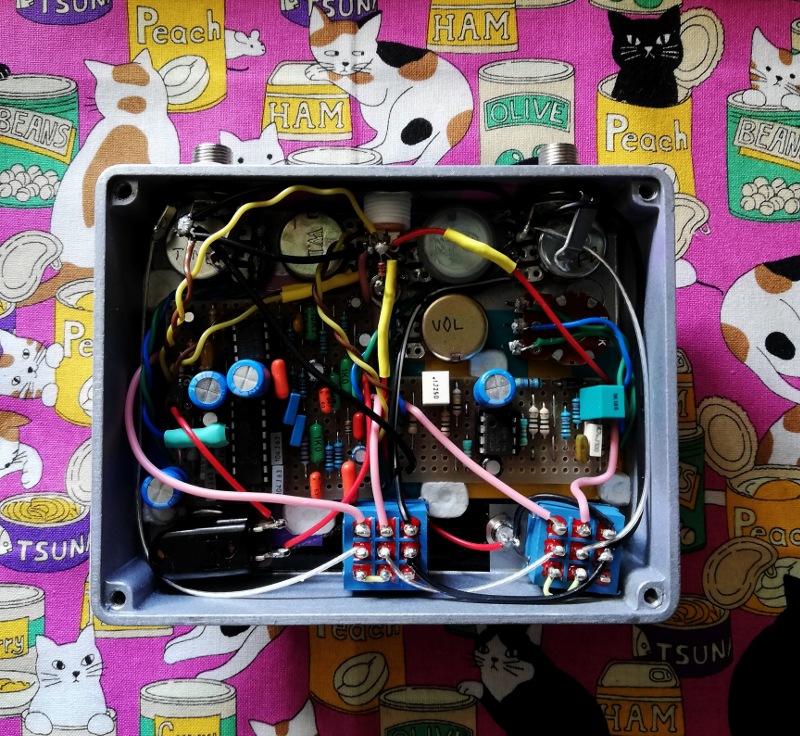 Here's a clone of the Crowther Prunes & Custard, which I didn't expect to be so crazy but it truly is. Very loud and abrasive but can also be tamed down to an overdrive type sound. Looking forward to try it with bass, I hear that's a thing. The weird design didn't allow for labeling of the bass/guitar and contour switches but whatevs. Also finally got to use these MIJ Alco knobs, just needed the correct size (1.5mil) hex key to fasten them.