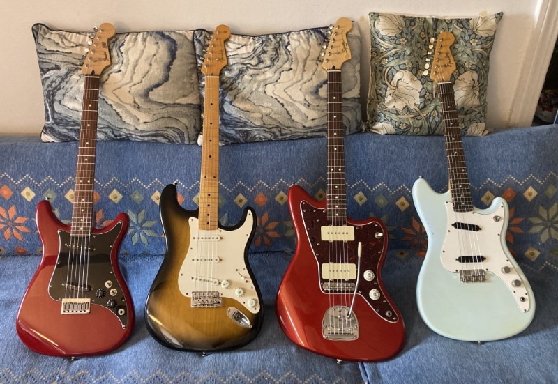 before i put them away i wanted to get a picture of the Fender-oid part of the group. only one of these is a "real" Fender, the 2019 Lead II. the JM is a 2018 Squier CV i bought cheap used and rehabilitated, the Duo Sonic was a project someone sold on Reverb cobbled together from a Squier CV DS body, a 22.5" scale Mini Strat neck, and Duncan Antiquity DS pickups, and the Strat as described recently is a 30-year-old StewMac body with a CIJ '56 Strat neck and Custom Shop '54 pickups. i've been having trouble deciding what to play because i like all these guitars so much.