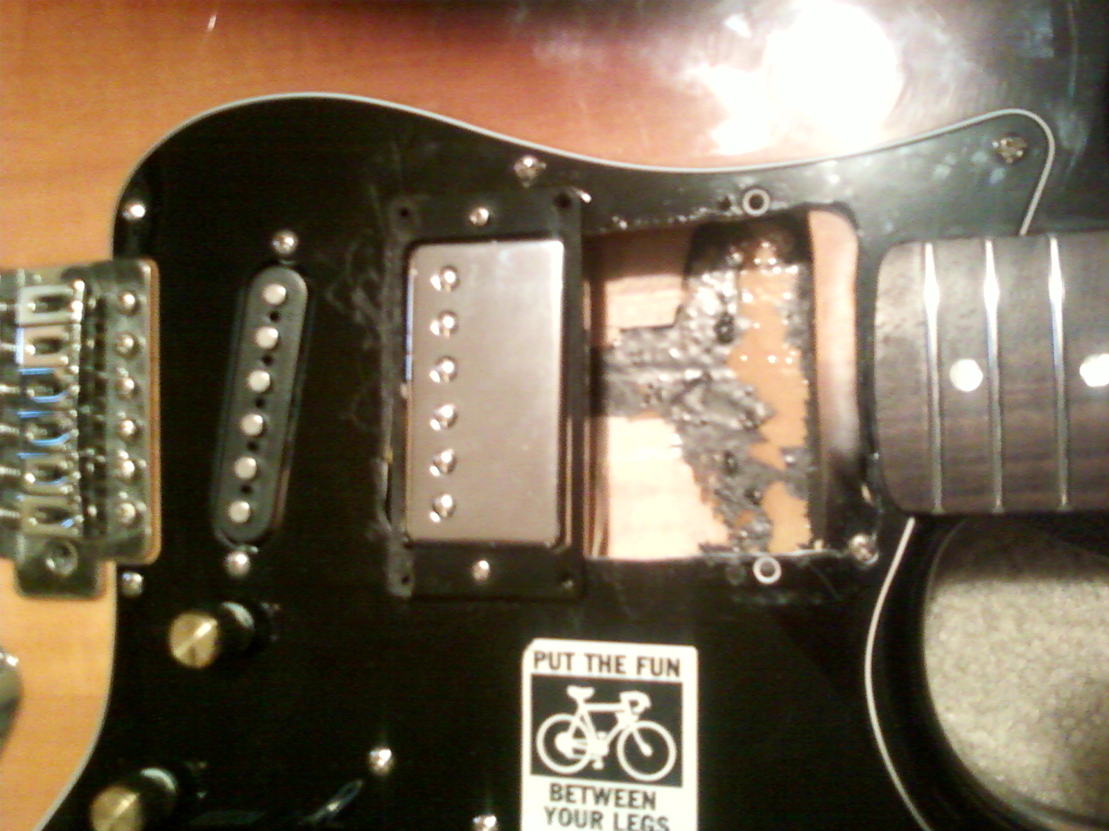 Okay so this is my first actual DIY, but I'm only 16 so... I'm starting easy. I basicly ripped apart my $120 Squier Bullet Strat and humbuckers (either from an Epi Les Paul or SG) where the middle and neck pickups were, changed some hardware to make it look better and did a little relic-ing.