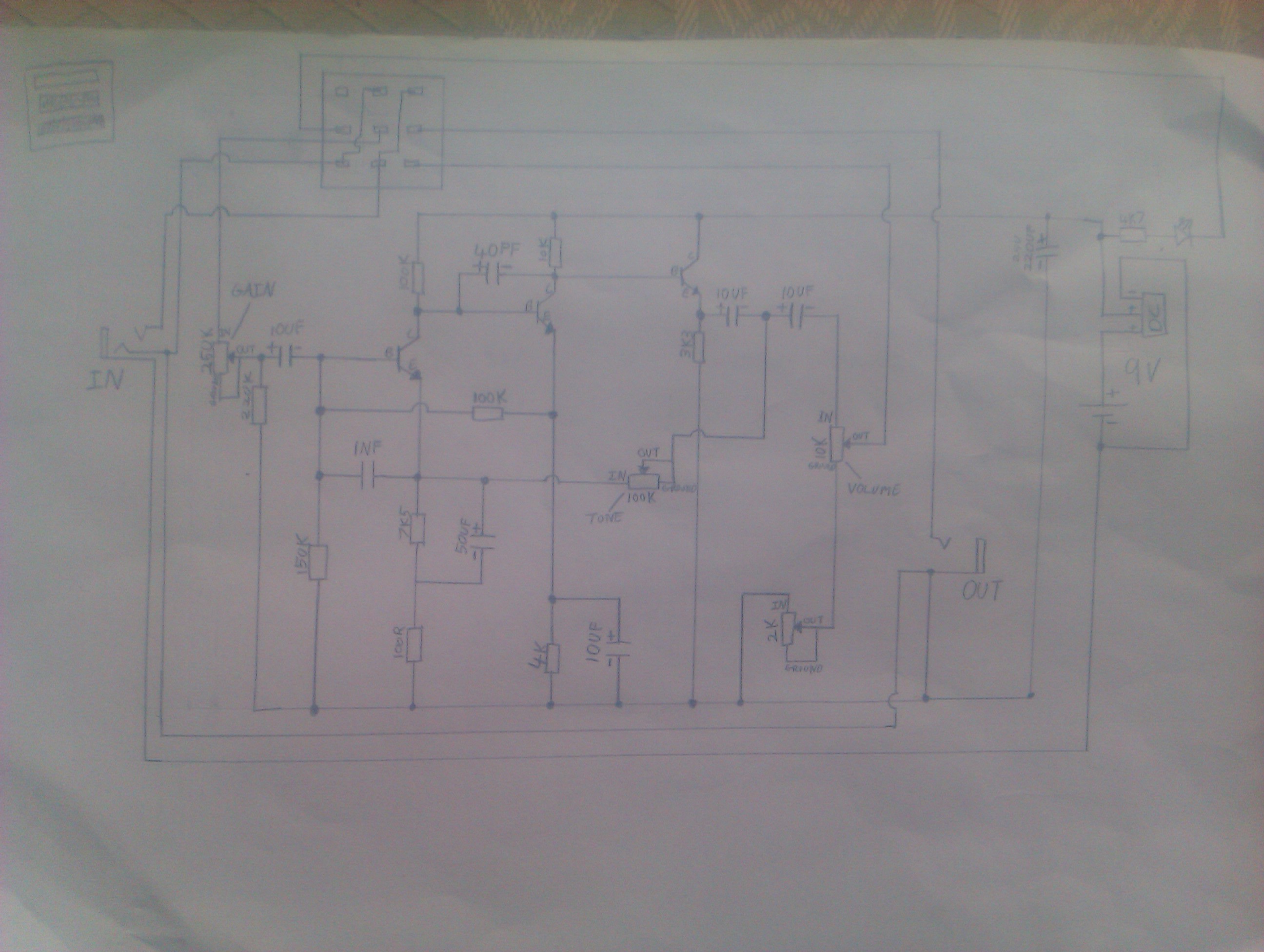 I've been attempting to build a unidrive clone. I have modded it with true bypass switching, led indicator, drive pot (to replace switch) and a tone control. I have drawn circuit diagrams and breadborded it, but it sounds awful. I even ordered some Matsushita 2sc859 from Small Bear, yet still no joy. I started with the original cuircit diagram from univox and went from there.