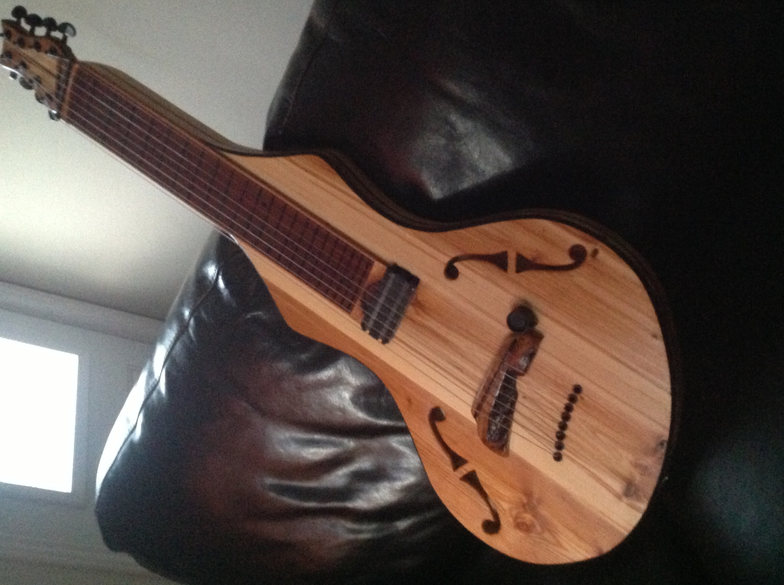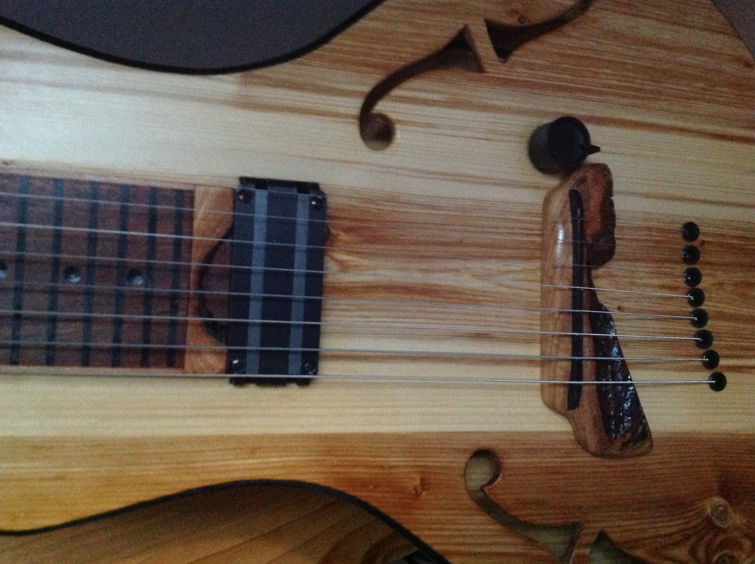 Carved out neck and body, all recycled cedar (old fence), mahogany fretboard with homade dyed black claylike markers, cherry and aluminum bridge and nut, lace x bar, volume with push pull single/humbucker.
