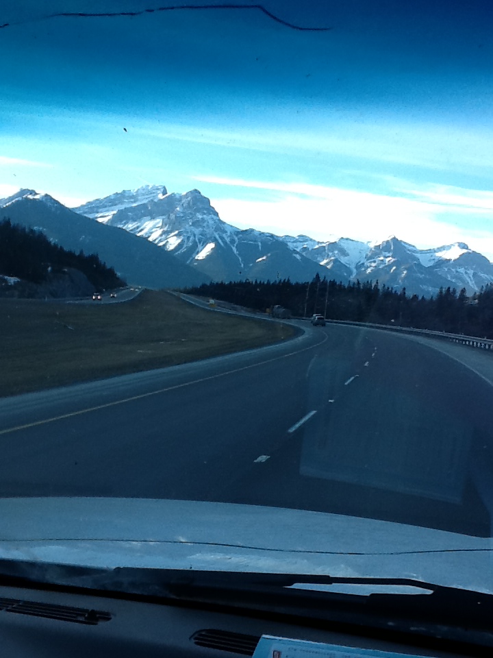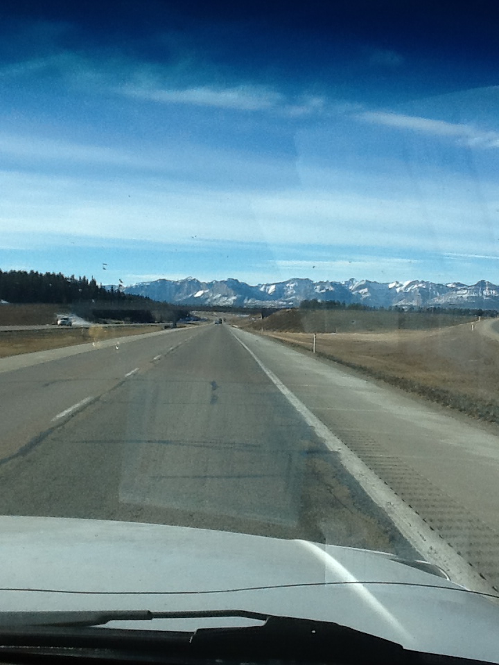 This is what it looks like about 3 hours south on our trip, around Calgary, the mountains are on the horizon: