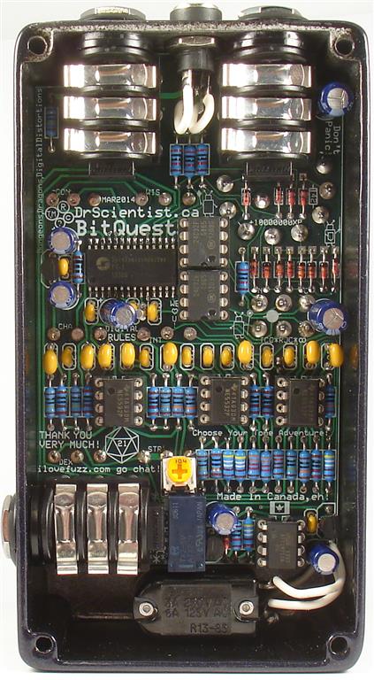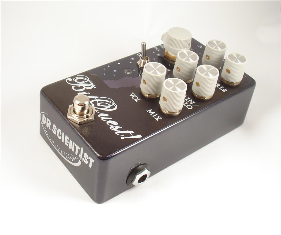 Submitted for your perusal, the BitQuest, a multi-effect pedal featuring 8 weird and cool digital effects that you can use with a weird and cool digital fuzz. Or you can use the effects without the fuzz for expanded control. The effects inside it include: Flanger, High Pass & Low Pass Filters, Bit Crusher & Sample Rate Reducer, Infinite Reverb, Notch Filter, Ring Modulator, +/- 1 Octave Pitch Shifter/Harmonizer, 1 Second Digital Delay. You can control the knob CTRL1, a dynamic and interesting control for each patch, with an expression pedal. The in/out/power jacks are on the top. You feed it 9-18VDC with 75mA of current. It's got soft touch relay switching and a lifetime warranty.