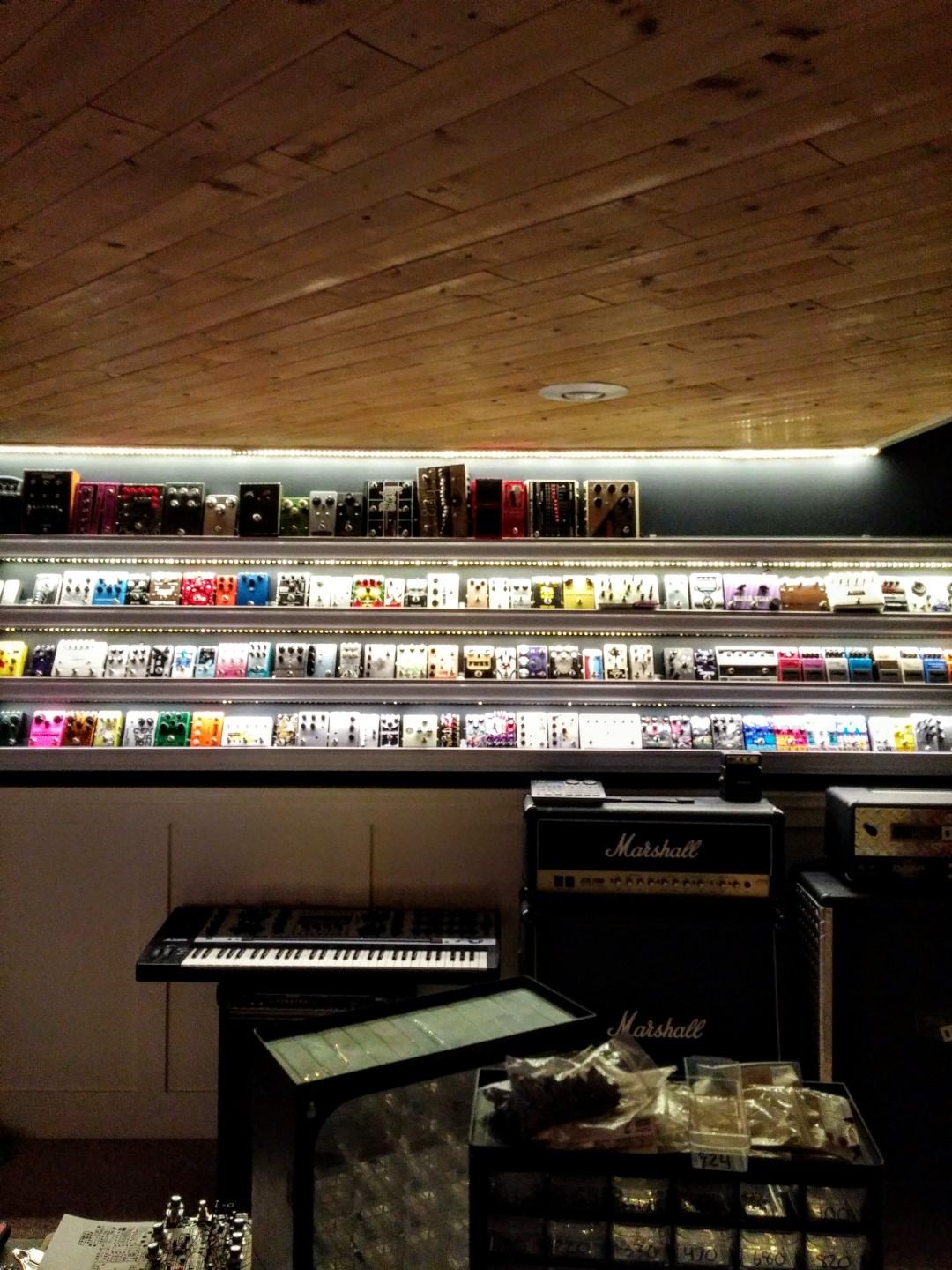I've been collecting pedals for over a decade, doing trades with buddies and peers, and I've got quite a few.. in my new shop here I wanted to have a cool display for them and Tanya saw a great idea for displaying kids books... rain gutters!