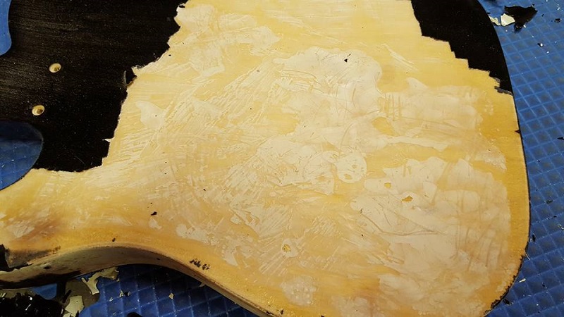 You can't see it in this pic, but the finish had uniform lines running parallel to the neck, which I thought were shrink lines, shrinking at seams in the wood pieces, leading me to believe it was like a butcher block and made of like seven pieces. I haven't stripped the front yet so I'll try to get a pic of what I'm describing.