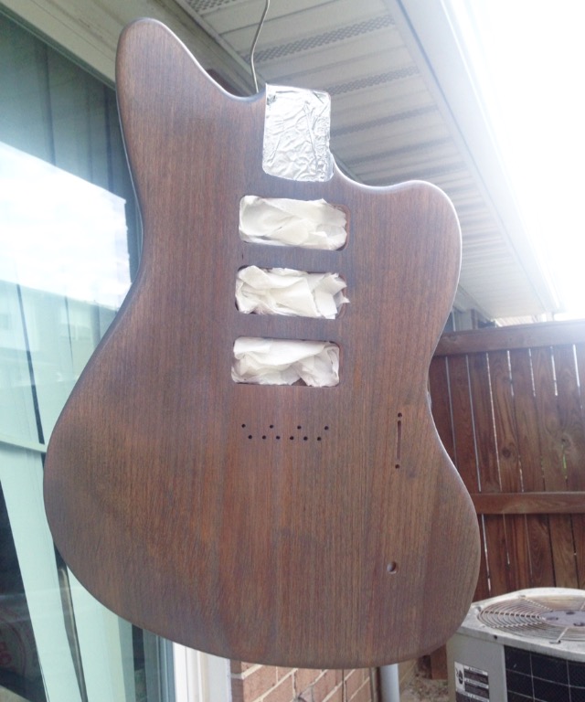 Let the body sit overnight and gave the stain a chance to dry. Blocked off the cavities and sprayed the first layer of poly this morning. Going to let it set for an hour and spray the second coat. I'll repeat two more times for a total of 4 coats. I'll let it dry into the afternoon, do a light sanding, and spray another 1-2 coats