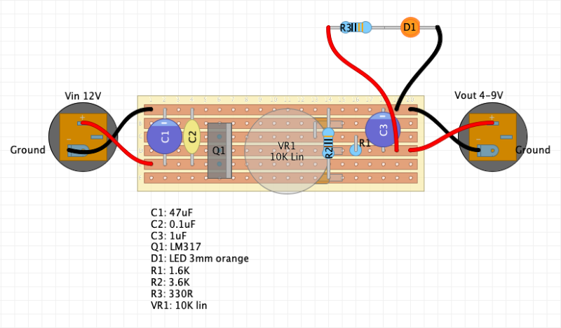What exactly does R1 do? I understand that it sets a minimum value for the output voltage Vout, so if I fed 9V into the circuit and use the suggested 240ohm resistor, the maximum voltage Vout with the pot fully clockwise would be 9V, the minimum voltage Vout with the pot fully counter clockwise would be about 4V - which would be ideal for the application with fuzz boxes. Is that correct? And if I'm wrong - what value of a resistor would I need and how should it be connected to have the power sag reduce the voltage to about 4V minimum but not less? I feel it makes sense to set minimum output voltage to 4V to utilize the full range of the poti in this application as the fuzz wouldn't do anything useful below half of its range.