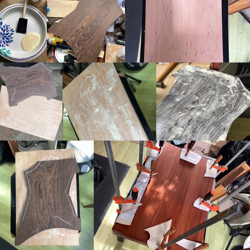 Wenge! I’m gluing a few small pieces to extend the points out because the body is 18” wide the wenge is 16”. Hopefully I’ll glue the top on tomorrow