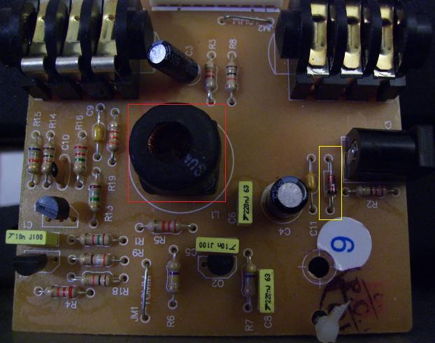 I can only guess it's that diode, or what looks like a diode, or that inductor... All the other components seem like stable ones... nothing is burned or exploded... I don't know anything about inductors or if they "go bad", but if I had to guess, I'd say I burned out the diode.