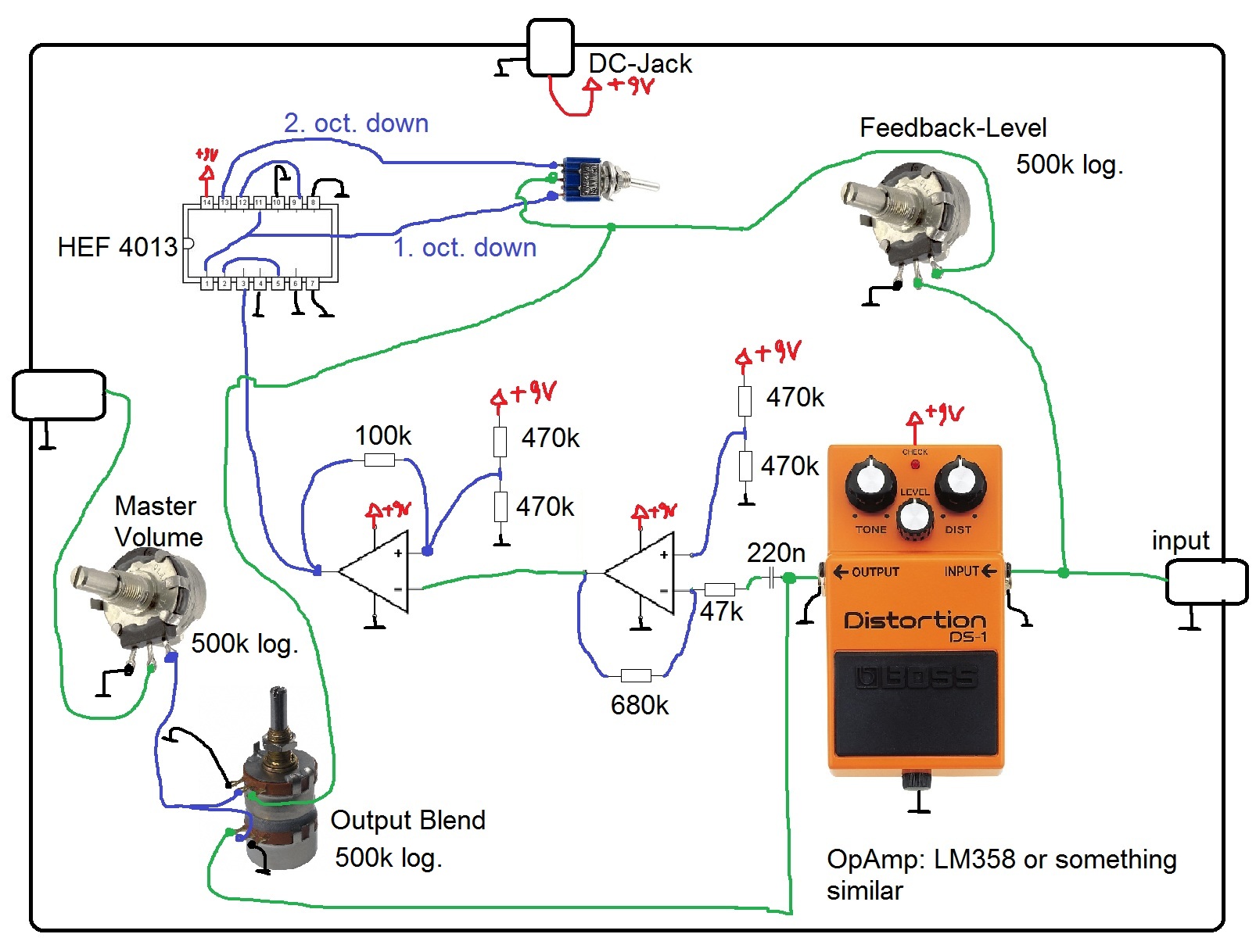 I don't know how the DS-1 fx/bypass switching works so I left the switch out of the plan.... you have to figure something out for the switching system... sorry :idk: