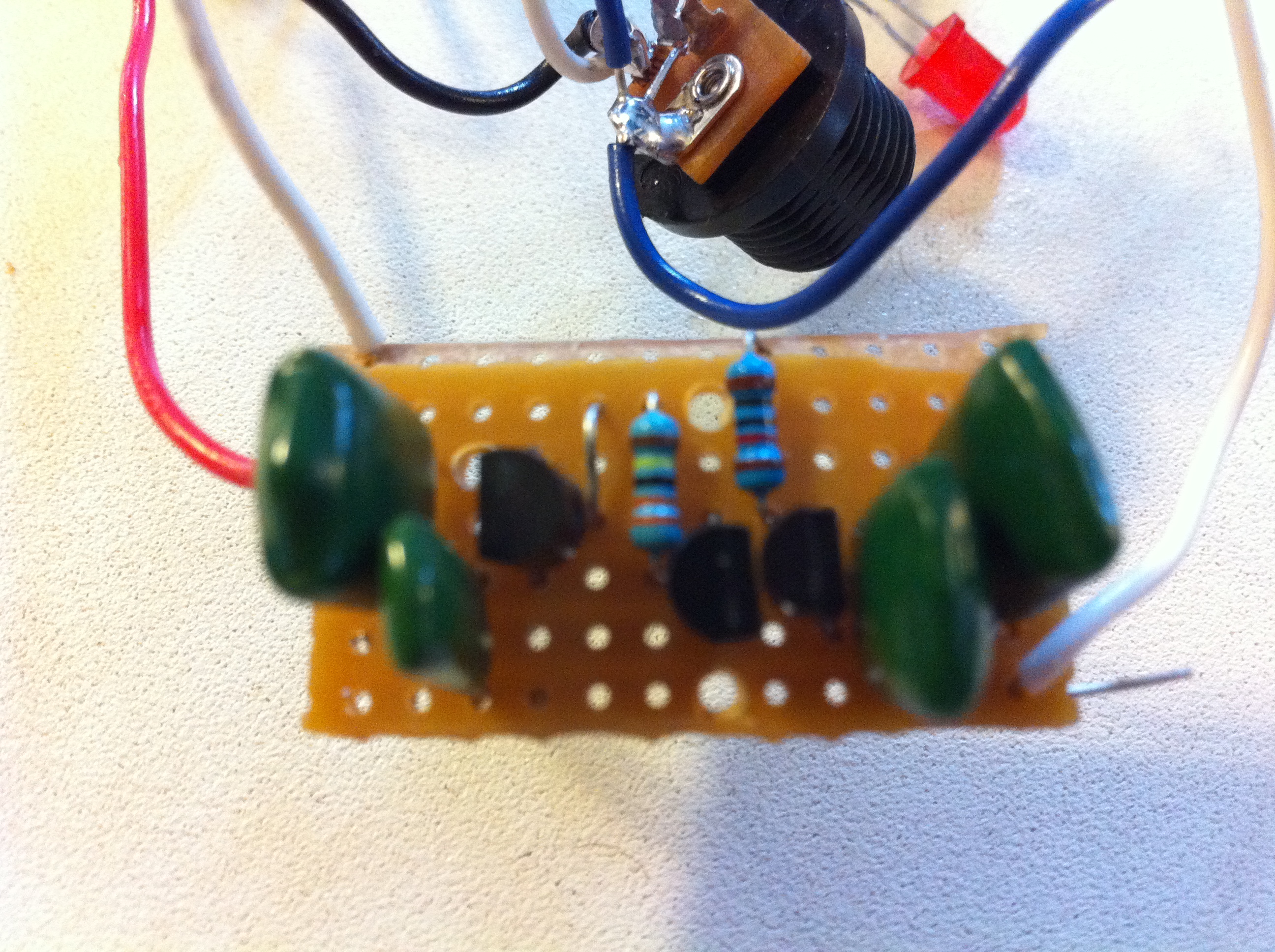 Does this help? E = emitter B = Base C = CollectorWhat I'm saying is that on the schematic here, the 104 cap that is furthest to the right and on the top, goes between the Volume 3 and the emitter (E) of Q1. But on your VERO board, it looks like the end of that cap that is supposed to go to the Volume 3, looks like it may go to the Volume 1, Ground, Q2 and Q3 collector (C) strip instead. I can't see that part of the board clearly enough to confirm that it is hooked up correctly or not.