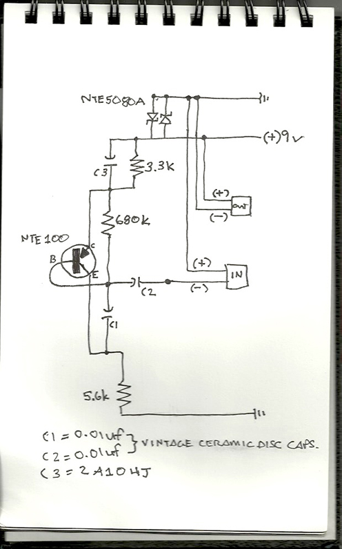 Okay here it is. It has been a while since I've drawn up a schematic. C1 and C2 are vintage ceramic discs about the size of a US Nickel and after some research I am pretty sure I got their values right.