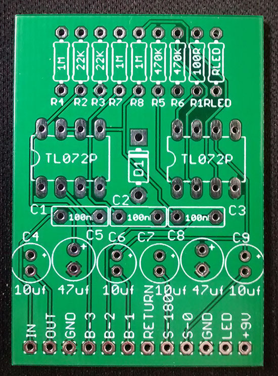 you only need to populate R1, R2, R3, R5, R6, C5, C7, C8, C9, IC2 (right side opamp in the picture). LED resistor is optional. the input jack tip gets wired to S-0. the output jack tip gets wired to S-180. all the grounds everywhere must be connected somewhere. power ground, PCB ground, jack sleeves, maybe the enclosure that is optional. your footswitch might have a ground if you have an LED. you might not want a footswitch here. maybe no LED. there are two grounds on the PCB so maybe it would be easier to wire power to the PCB then use the extra ground to run to both jack sleeves.