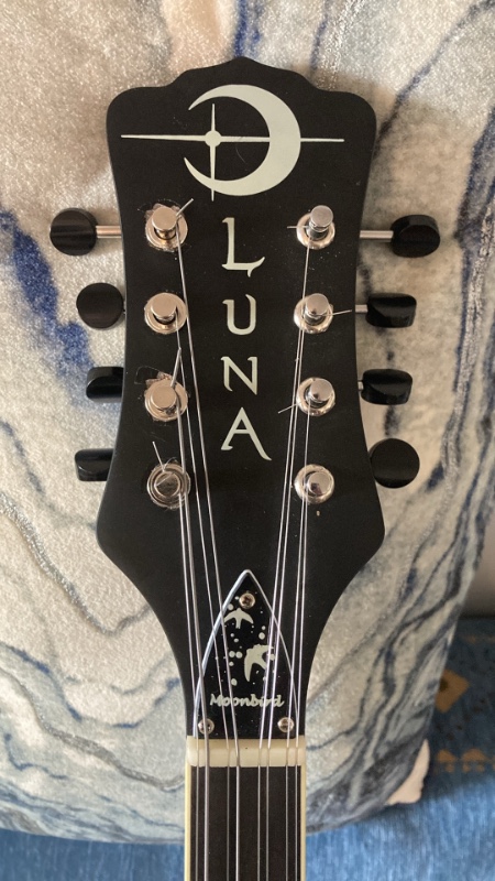 after playing with the electric bouzouki i noticed issues. primarily, the tuners were terrible. using a clip-on claiming .01 cent accuracy, they still were out almost immediately. i’m not sure why they specced the Luna with Gibson F-style mandolin keys, but that narrowed down the options. it is NOT EASY to find high-ratio tuners that don’t cost $250 the set and have black buttons to match the Luna, but i found some. weirdly, they're closed back Klusons on a strip. the new tuners are SO MUCH BETTER. no wobble in them at all. the new knob shafts are a mm or 2 shorter, but my small fingers have no problem with the knob/headstock distance.
