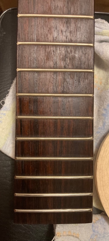 i finally got it up to start working on the Hopf. i thought i might get away with not sanding the fingerboard, but it was just too rough. so i went at it with 800->1200 grit and then polishing with lemon oil. the board is really nice rosewood and feels smooth. i guess i’m never going to get the surfaces just exactly perfect (h/t Bob Weir) but it’s a lot better. the bottom 3 frets took maybe a couple of hours; at this rate i’ll be on to mounting the neck to the body maybe next weekend and then the pickups and pickguard mods which will be the tricky bit. but there’s not all that much to do, so it’ll be ready before spring.
