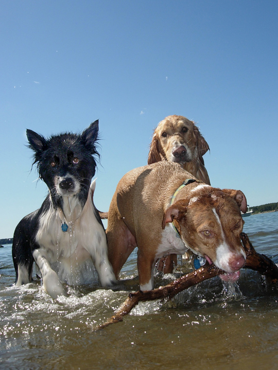 One of my favorite pictures ever of my friends dogs and mine, because it's so ridiculous. My buddy's dogs are the two on the left, Rex (the border collie) and Luna (the pit mutt). Nugget is mine, on the right. For the record, while Luna looks like a total hellhound here, she is a complete softie, and the least dominant member of the pack (though she's totally a shitstarter, and will always try to steal toys from the others when they're distracted).