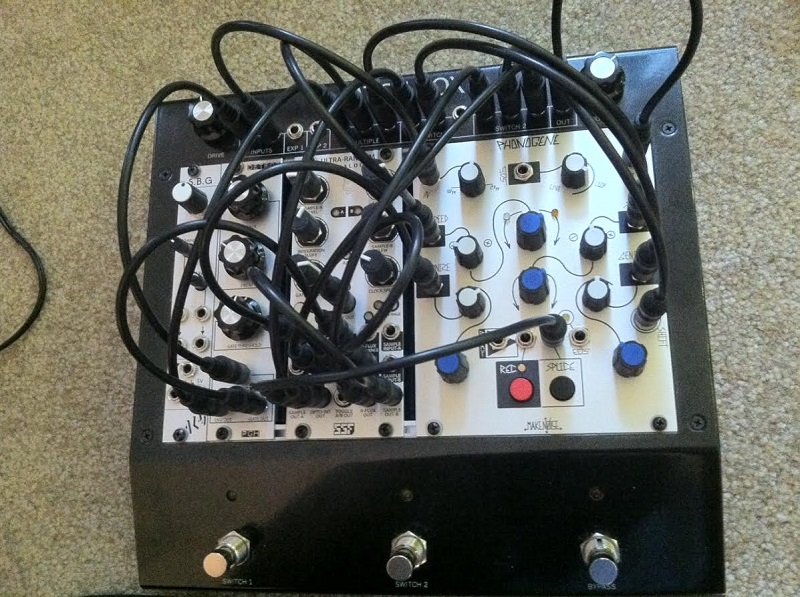 Make Noise Phonogene is the main attraction, using PGH Envelope follower and SSF Ultra-Random as modulation. Patch Box has multiples and lets you patch into the two Stomp Switches so you can turn on/off modulation sources as you please. Ultra random self patched and a Knas Moisturizer is also modulating and being modulated by the Patch Box.