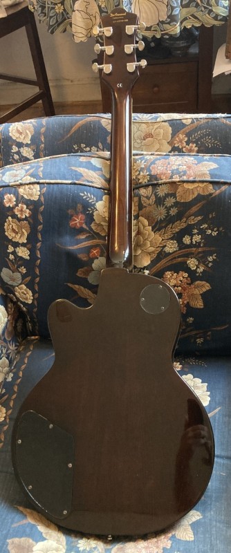 something i noticed immediately when oiling the fingerboard is that the M-77T neck’s angle and relationship to the body raises the end of the fretboard a good quarter-inch above the top compared to the M-75. i should compare it to the M-75T and see what its neck join looks like. if i wanted to give it a floating bridge, the extra space would probably be enough for a rosewood bridge base or Gretsch/Melita bridge, but i doubt i’d hear much tone difference considering how thick the top is. that top is also flatter than the M-75s, with much less “dish” in the top like you see in a Gibson Les Paul. there’s still some arch, but it’s visibly less. this appears to have been a change to make the M-77 more like the original Bluesbirds rather than the more arched tops that came in on 80s and later ‘Birds which are noticeably more Les Paul-esque.