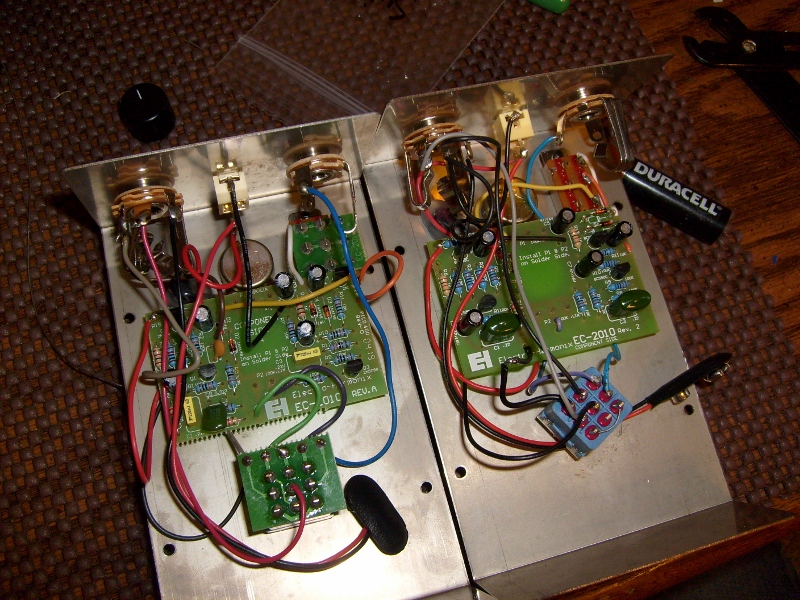 Here's the guts of the two different DMuffs I mentioned. Obvious thing you'll notice is the layout...then the use of 5088's vs bc550's...the switch pcb...I think the values are the same. The right one is mine, and it use to have another cap+res in between the black leads from switch and board.