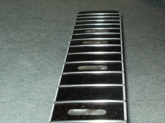 all righty, then. first, the fingerboard in its initial state of completion. some additional anal-retentive levelling may result, but not if i can avoid it. there's maple dust in the grain of the rosewood, which will wipe off.