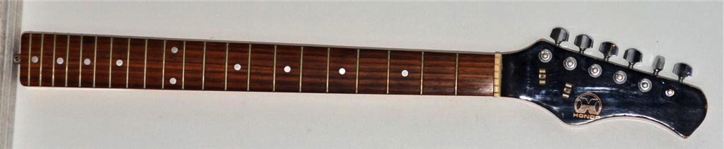 meanwhile, the neck and bridge for the Hopf arrived. i don't know for sure if the Hondo neck is going to work...i had to estimate based on the Hondo's claim to Strat scale and the Hopf spec of 25.25". the bridge--a a simple Hagstrom/Teisco bar with a two-screw mount--is easily moved, so God willing it'll line up. the neck needs some attention--there are some sharp fret ends and crookedly-mounted dots in the fretboard that have to be fixed--but i'm letting it sit on the back burner until the Hopf body arrives, which could be any time from Wednesday to a week thereafter.