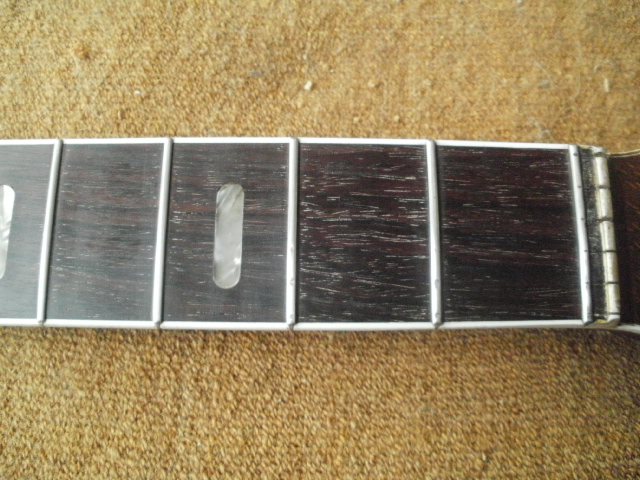 it's been difficult to get rid of the fingerboard ruts in the cowboy positions without a certain unevenness. i don't want to go farther down than i have because the frets could figuratively end up standing on hedgerows. n.b. the difference in slickness and hue between the first two frets and the rest of the board is because those spaces had just been completed.