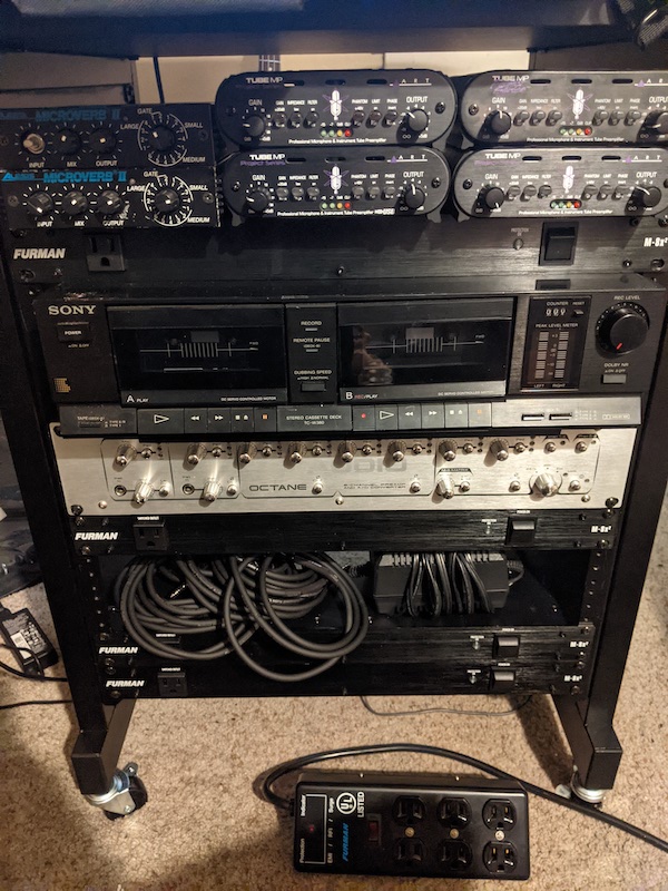 What you're seeing, left-to-right and top-to-bottom, is space at top->2 X Alesis Microverb II reverbs->4 X ART TubeMP tube preamps->Furman 9 outlet strip (top screws only to allow sandwiching of unmounted tapedeck)->Tapedeck->M-Audio Octane solid state preamp->identical Furman strip->space for power supplies to rest on->2 X Furman strips; and lastly, on the floor, a Furman 6 outlet non-rack power strip